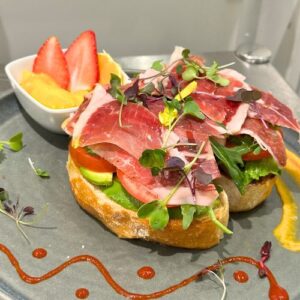 Your toast comes with a mini fruit bowl or mini avomole bowl. Choose gluten free bread for 2.00€