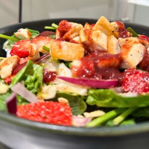 Pollo a la plancha, lechuga, fresa, espinacas, cebolla morada y frutos secos con aderezo de fresas hecho en casa(Puedes elegir la opción sin frutos secos)