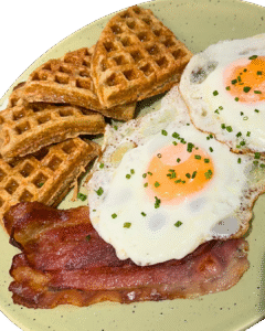Made with oat flour and sweetened with dates. It comes with 3 waffles, 2 bacon strips and 2 eggs.